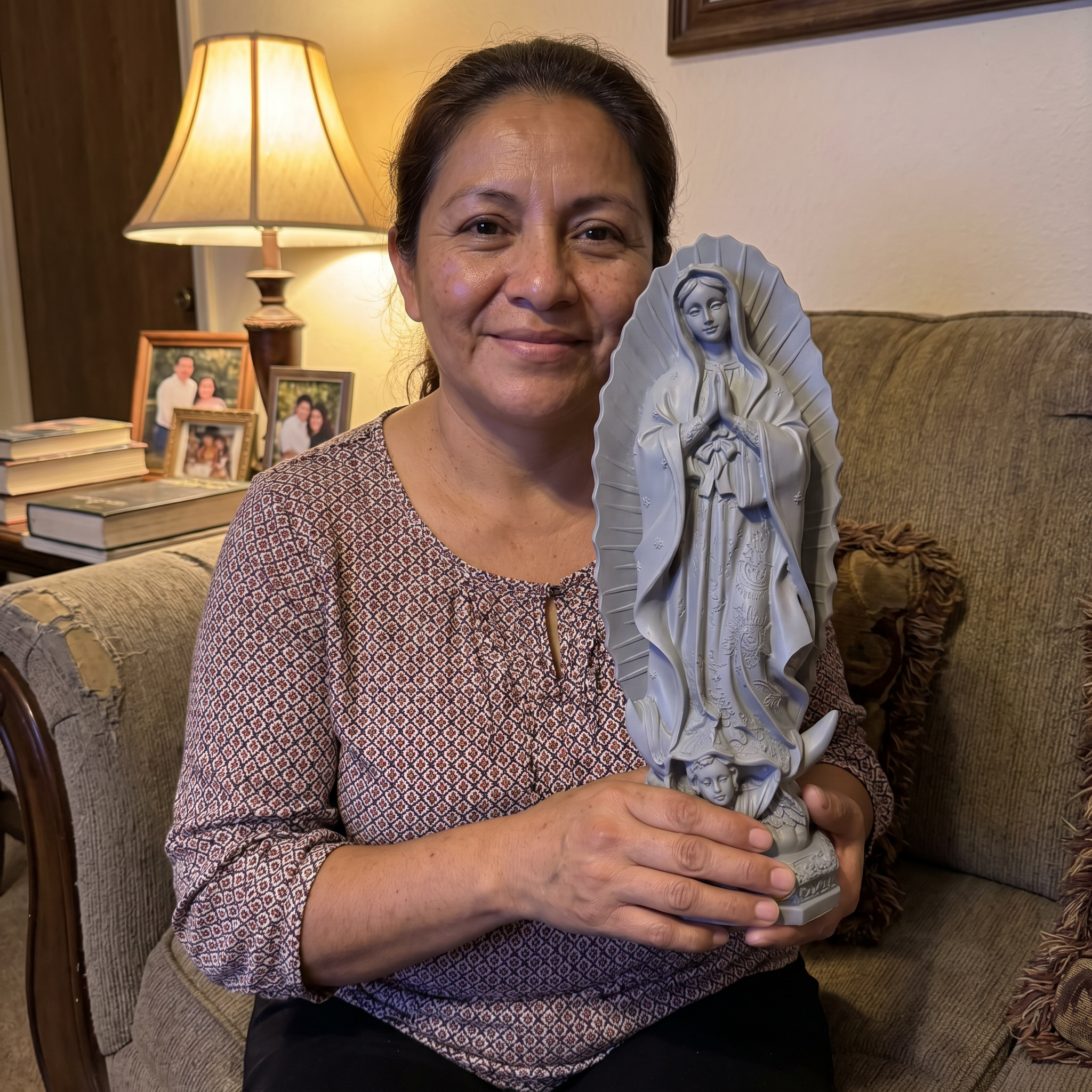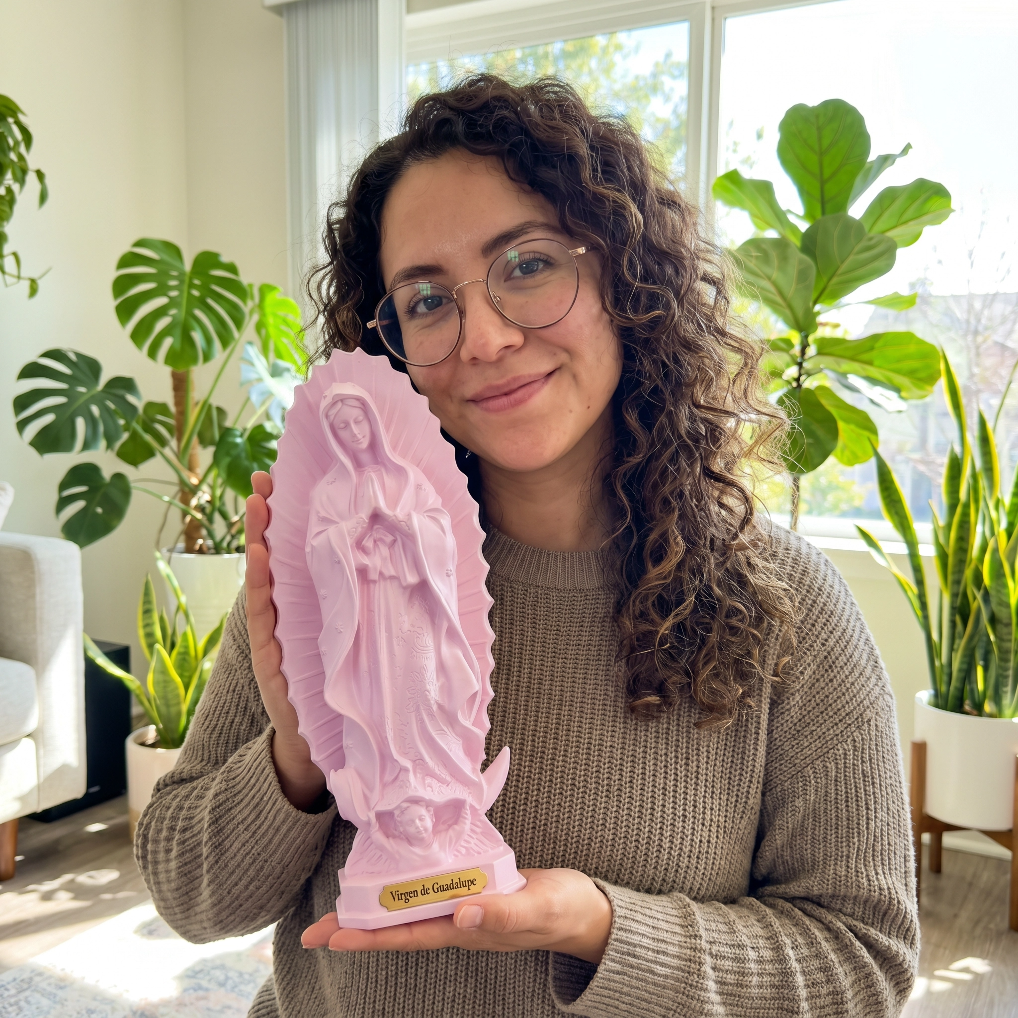 Mide aproximadamente 25 cm de alto. Es un tamaño ideal para altar, repisa o mesa de noche.